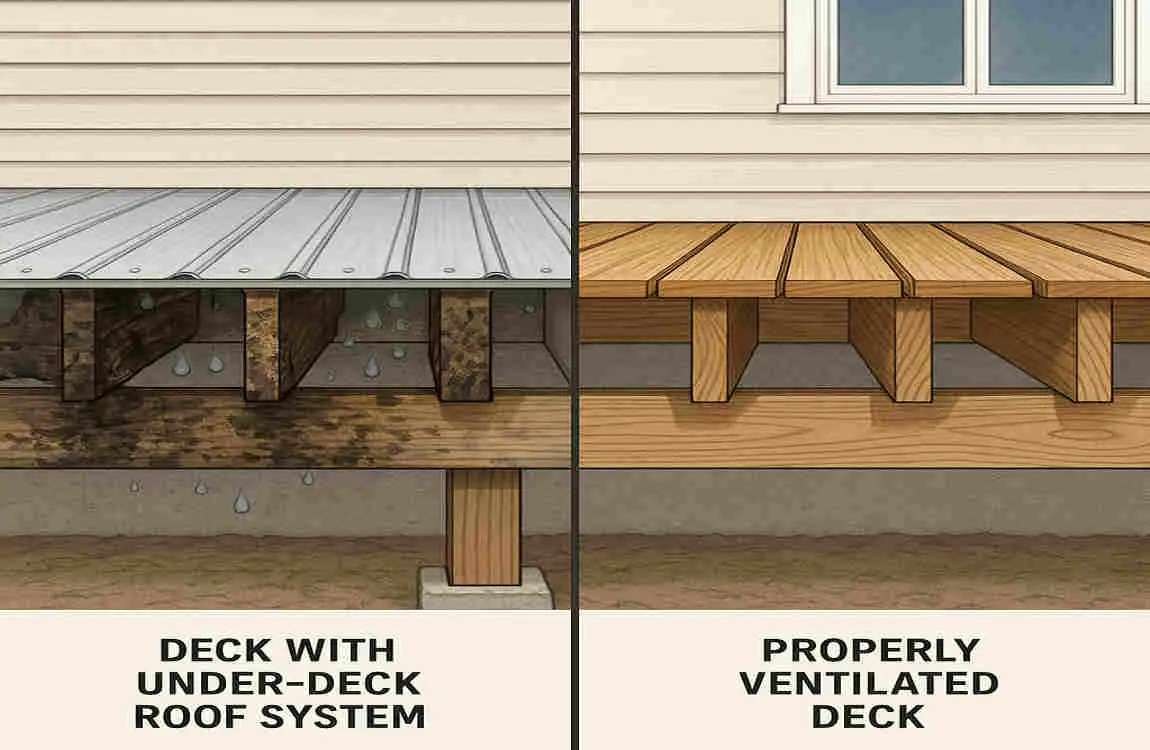 Experts agree that under-deck roofs don’t inherently cause rot, but they can contribute to it if moisture is not managed correctly. Studies have shown that wood decay is directly linked to prolonged moisture exposure, which can happen in poorly ventilated or improperly installed under-deck systems.