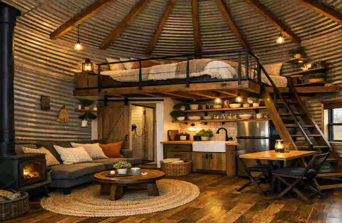 Raw steel walls might seem cold, but with the right approach, they become a stunning backdrop for warmth. Layer textures generously—soft throw blankets, plush area rugs, and tactile wall hangings all help soften the industrial edge. Wood elements are your best friend here. Consider cedar planking on one curved section to create a focal wall that adds both visual warmth and a pleasant aroma.