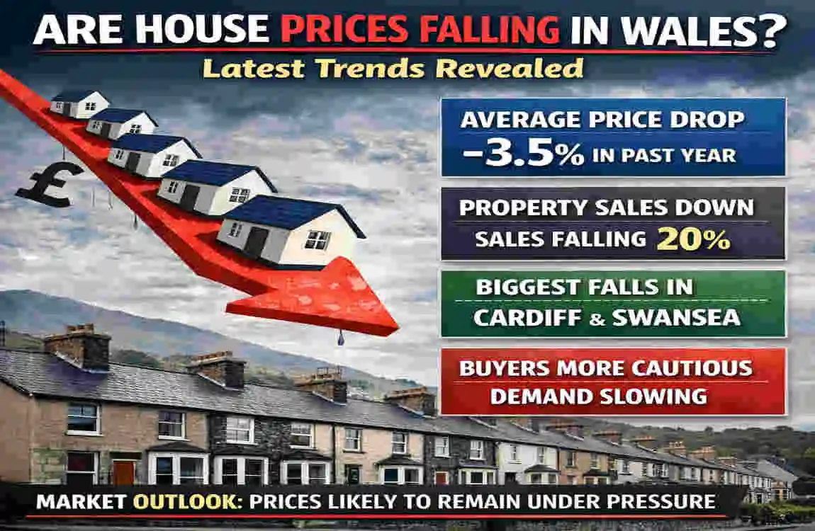 Are house prices falling in Wales right now? Yes. As of early 2026, data indicate a year-on-year fall of approximately 2.1%. The market is cooling after the post-pandemic boom.