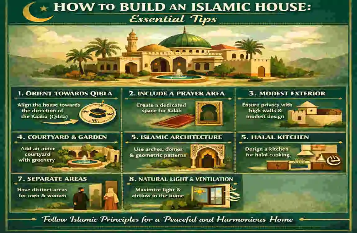 An Islamic house is designed around privacy, cleanliness, modesty, family life, and prayer. It may look modern or traditional, but the layout and features are planned to support Islamic values in daily living.